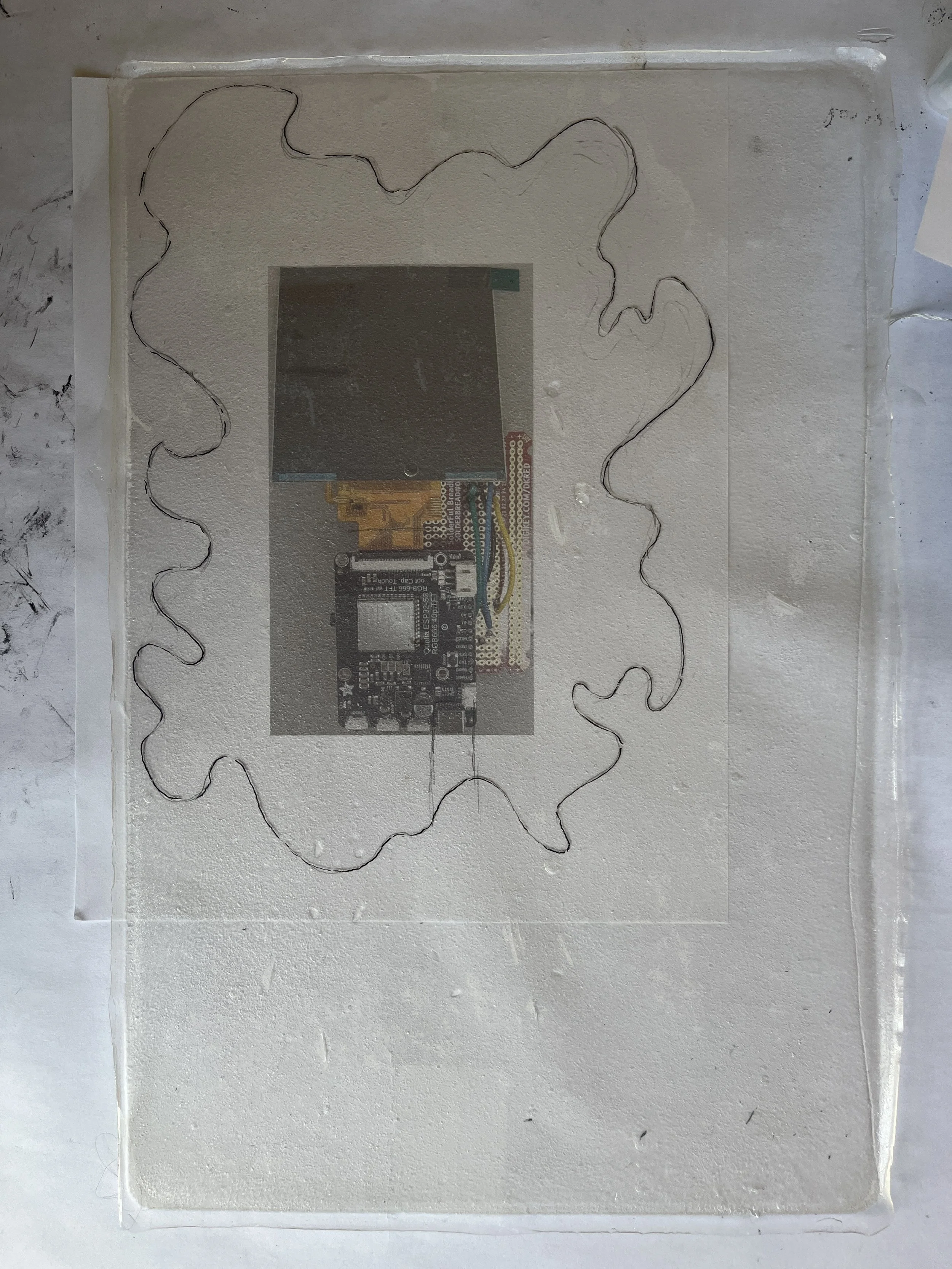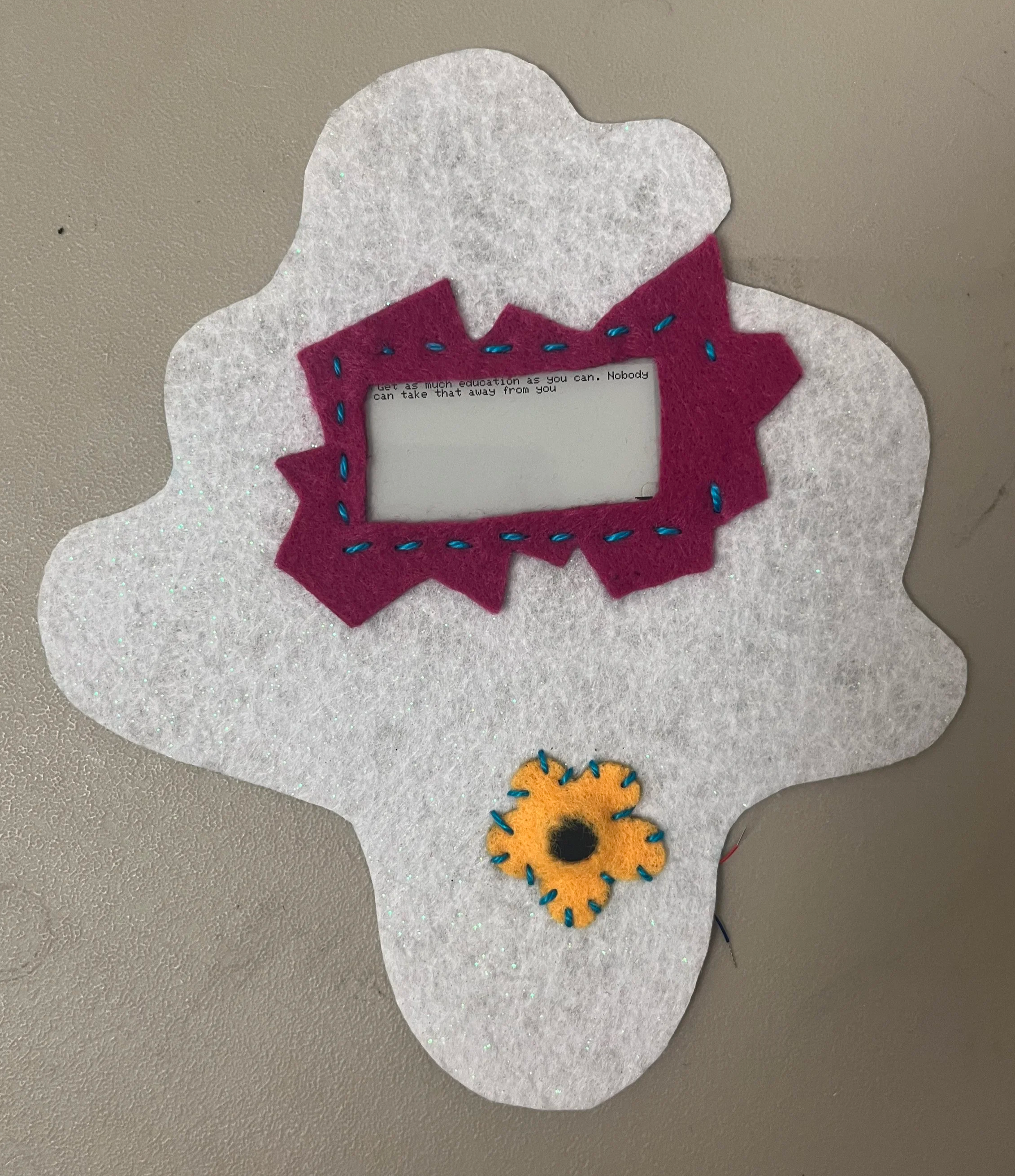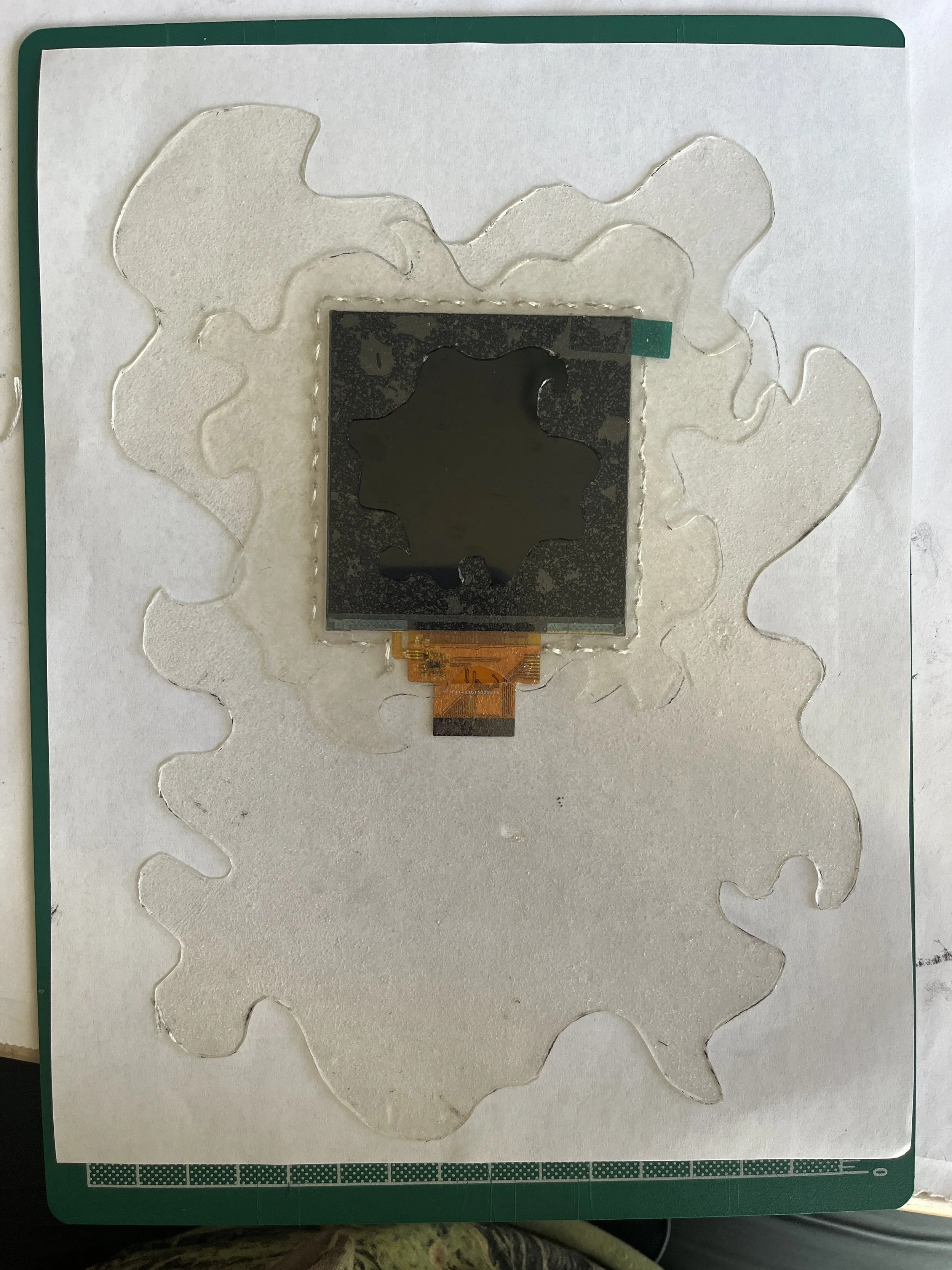 Now that I had a reliable video player I could focus on the form. I made a quick prototype in felt, sewing an EPD and a vibe motor onto a simple, speculative interface. I also tried out a button enclosure on some bioplastic scrap I had laying around.