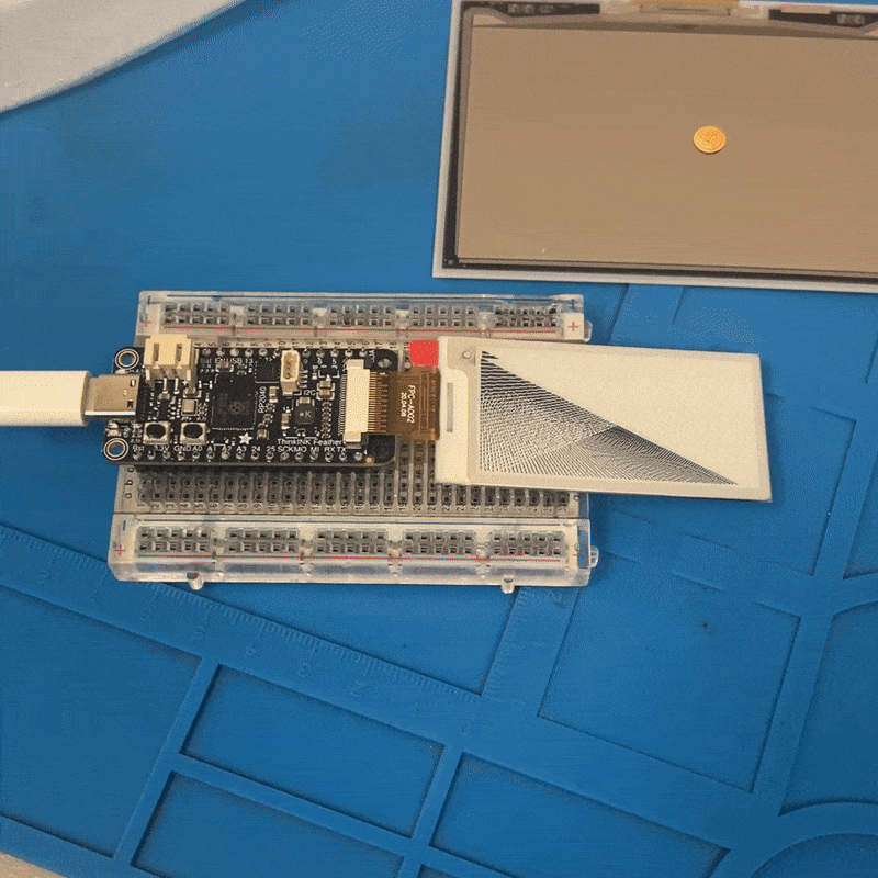 So, I found this Feather board from Adafruit for running EPDs and was convinced that I could replicate the setup with a large and colorful E-paper display. It also seemed promising that the microcontroller was an RP2040, those are what people use to play videos, right?! Adafruit, as we know, has amazing documentation, so getting a small EPD running was no problemo.