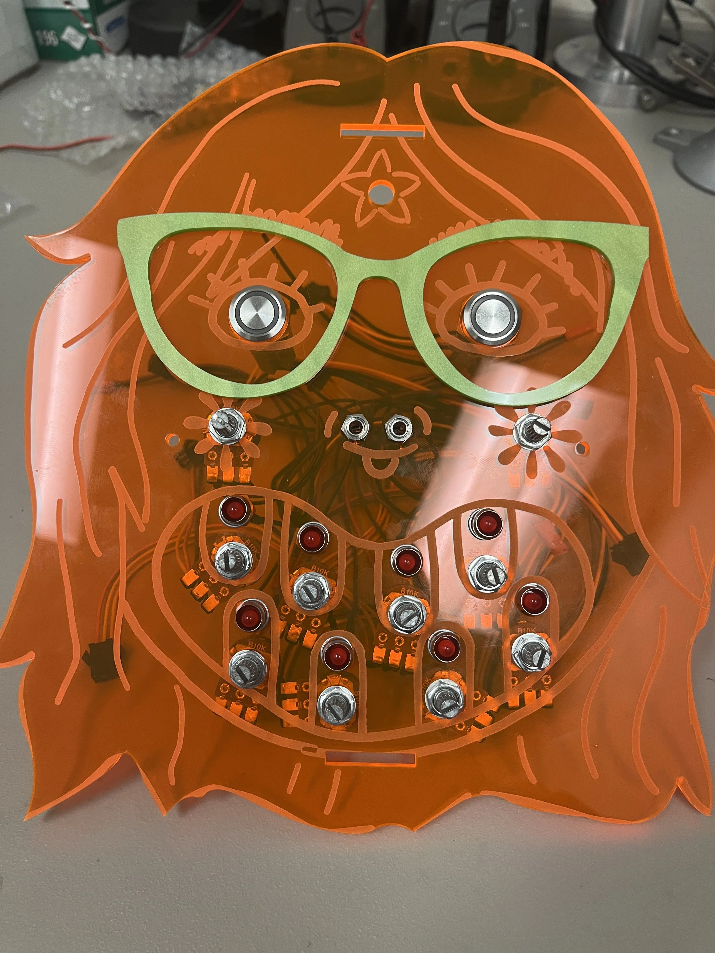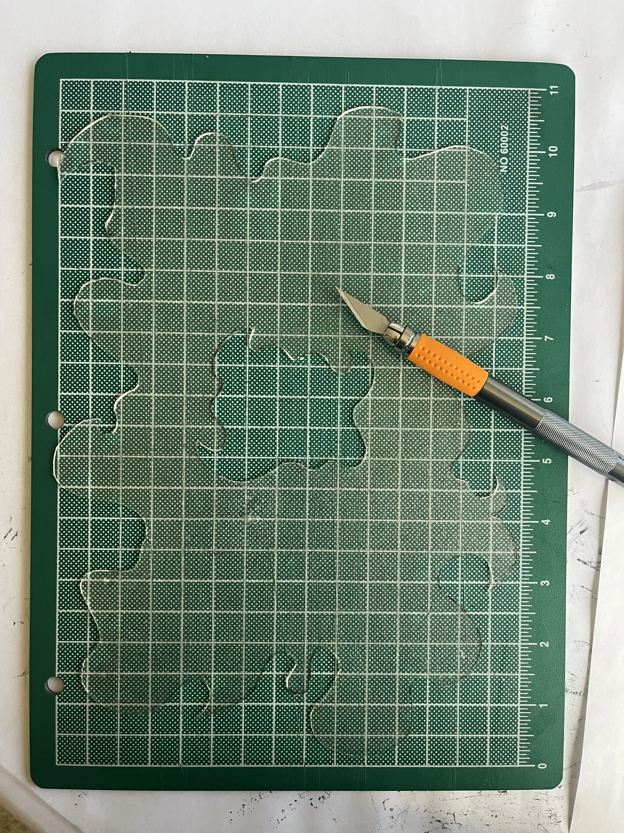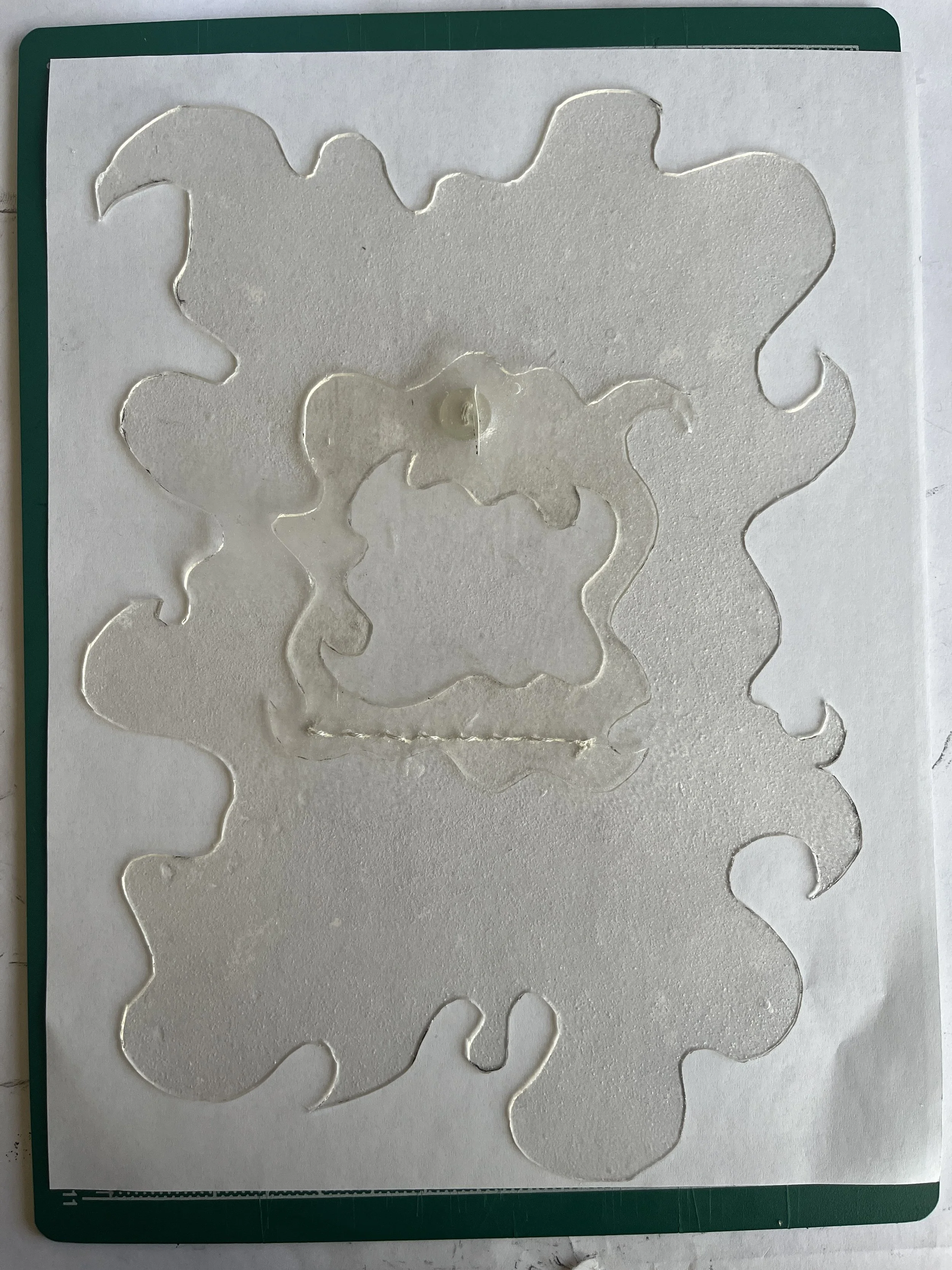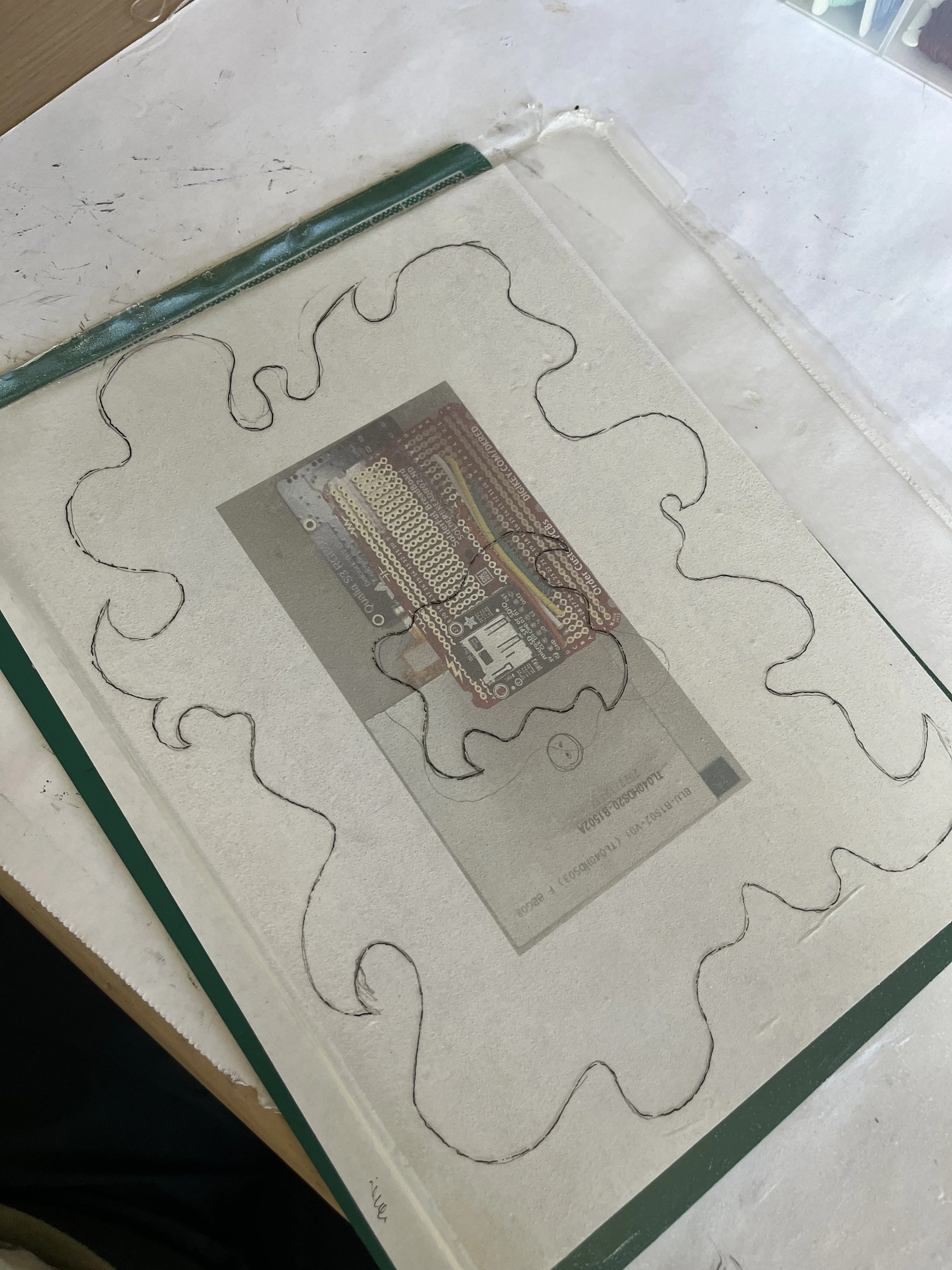 This was a kind of quick, intuition thing. I just printed out a picture of my circuitry to scale and sketched out curly, spikey shapes to use as a guide for cutting the bioplastic with an X-acto knife.