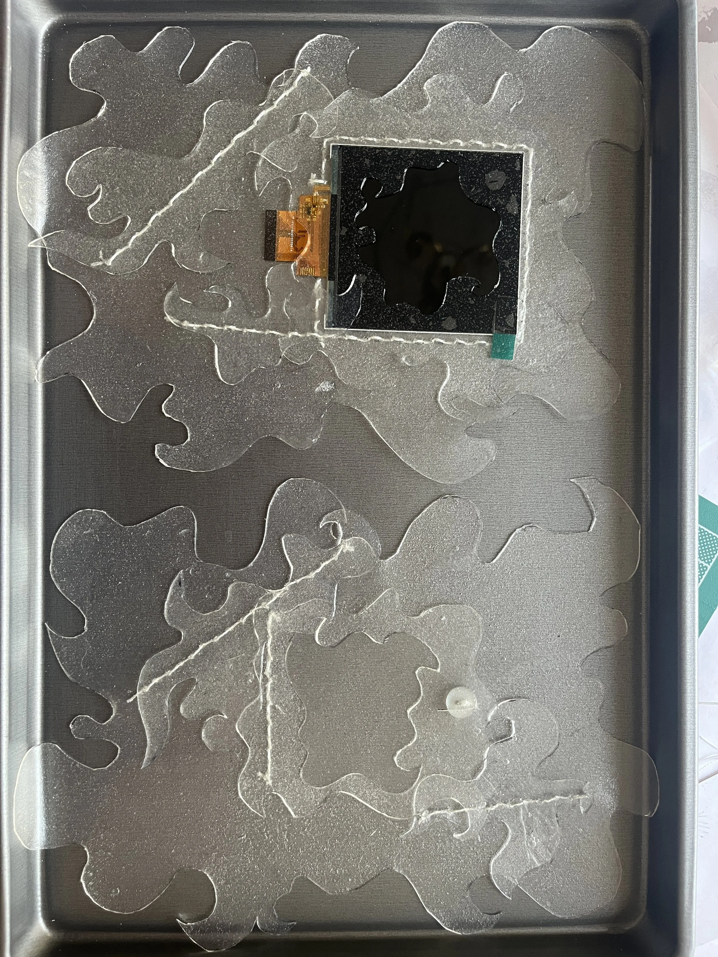 Then I sewed the screen into place, between two pieces of bioplastic. I also cut some ornamental pieces and sewed those onto the front/back sheets. Lastly, I assembled the circuitry again and sewed the front piece on to the back using a running stitch with the electronics in between. Like I mentioned before, the material I made wasn’t the most strong and I found it becoming more moist and fragile the more I worked with it, so sometimes it needed a break in the fridge.