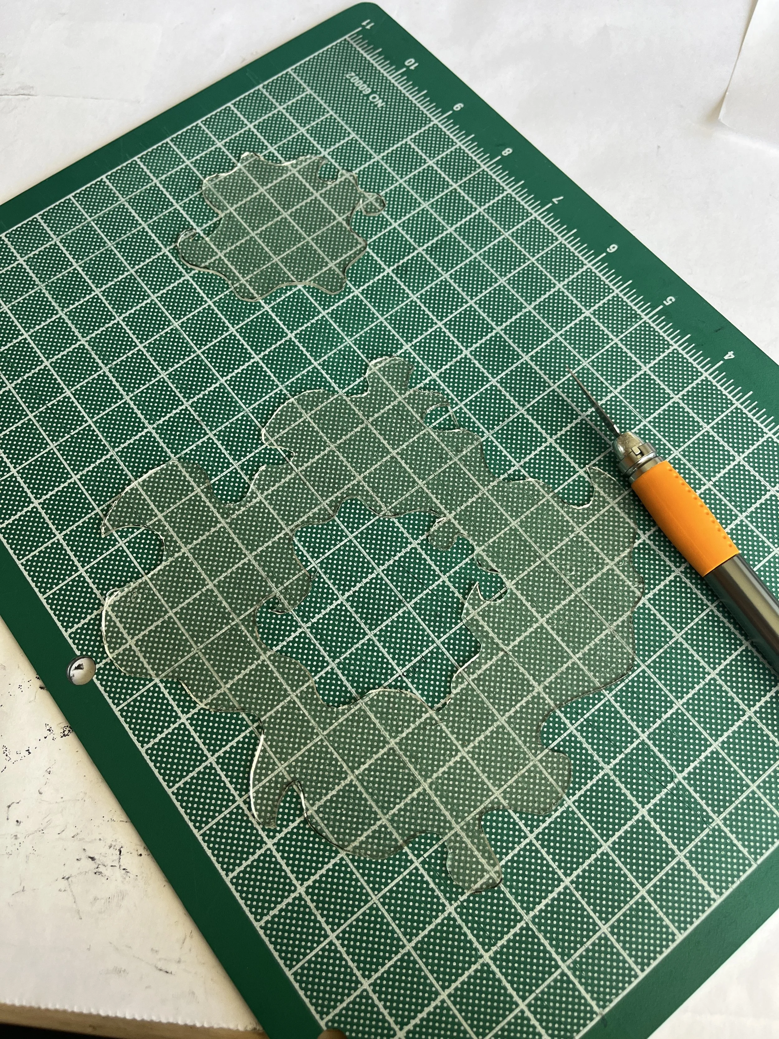 The material that I made ended up being beautiful but just barely working for this project. The sheets ended up much thinner and more fragile than material I’ve made in the past. Also, the more I worked with it, the stickier I feel it became. It was wet! I think this is because I’m still learning to make these bioplastics in a desert climate. The kitchen I was working in was definitely much warmer than spaces I’ve worked in in the past. Also, I’m still suspicious that different brands of agar cook and behave differently.
