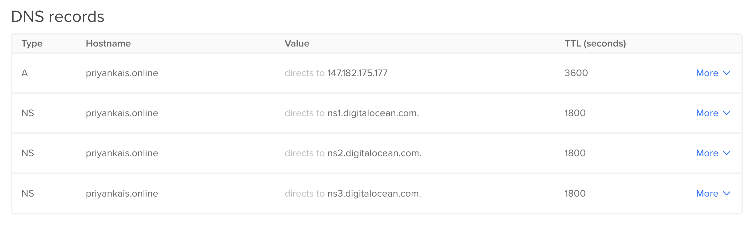 I ended up getting the custom domain “priyankais.online” from NameCheap for a whopping $1.66/year. The first image shows how I pointed the domain registrar to DigitalOcean name servers and the second image shows the DNS record on DigitalOcean