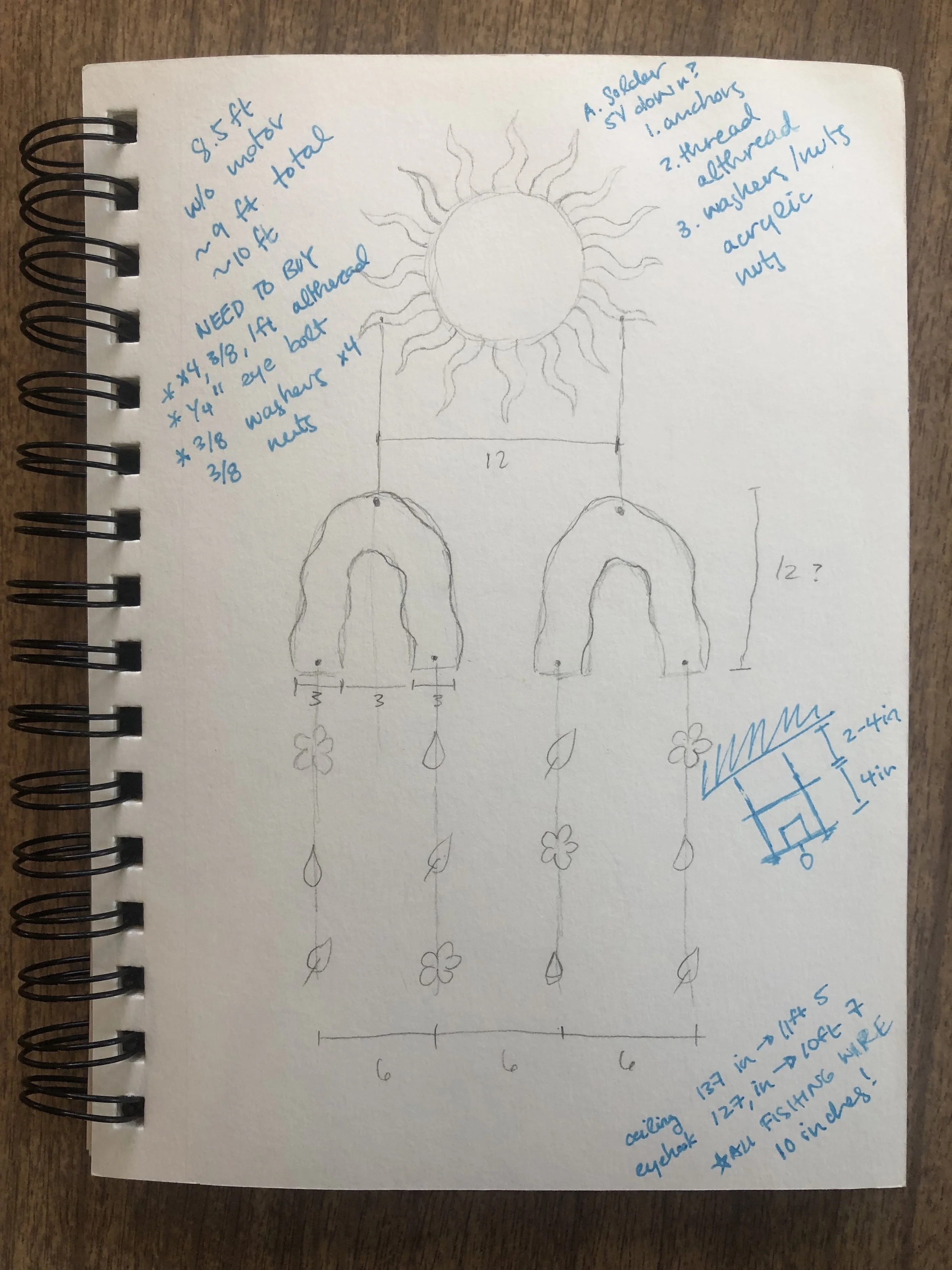 Now that I had all the separate parts, I was ready to string everything together. My mentor and client Trey Duvall invited me over to his studio to practice installation. He’s got high ceilings! First, he helped me plastic weld the sun together. We did some measuring and tied the top parts to the tails. Then we put together the motor housing and practiced what it would be like attaching everything to the dry wall in the museum. Sourcing all the screws, nuts, and washers was another thing I’m not too familiar with, but Trey gave me a shopping list of what I would need.