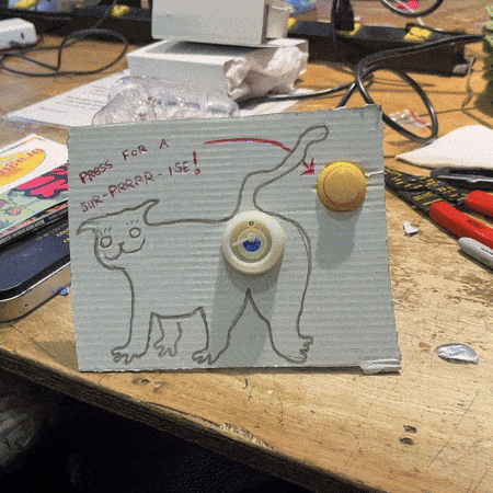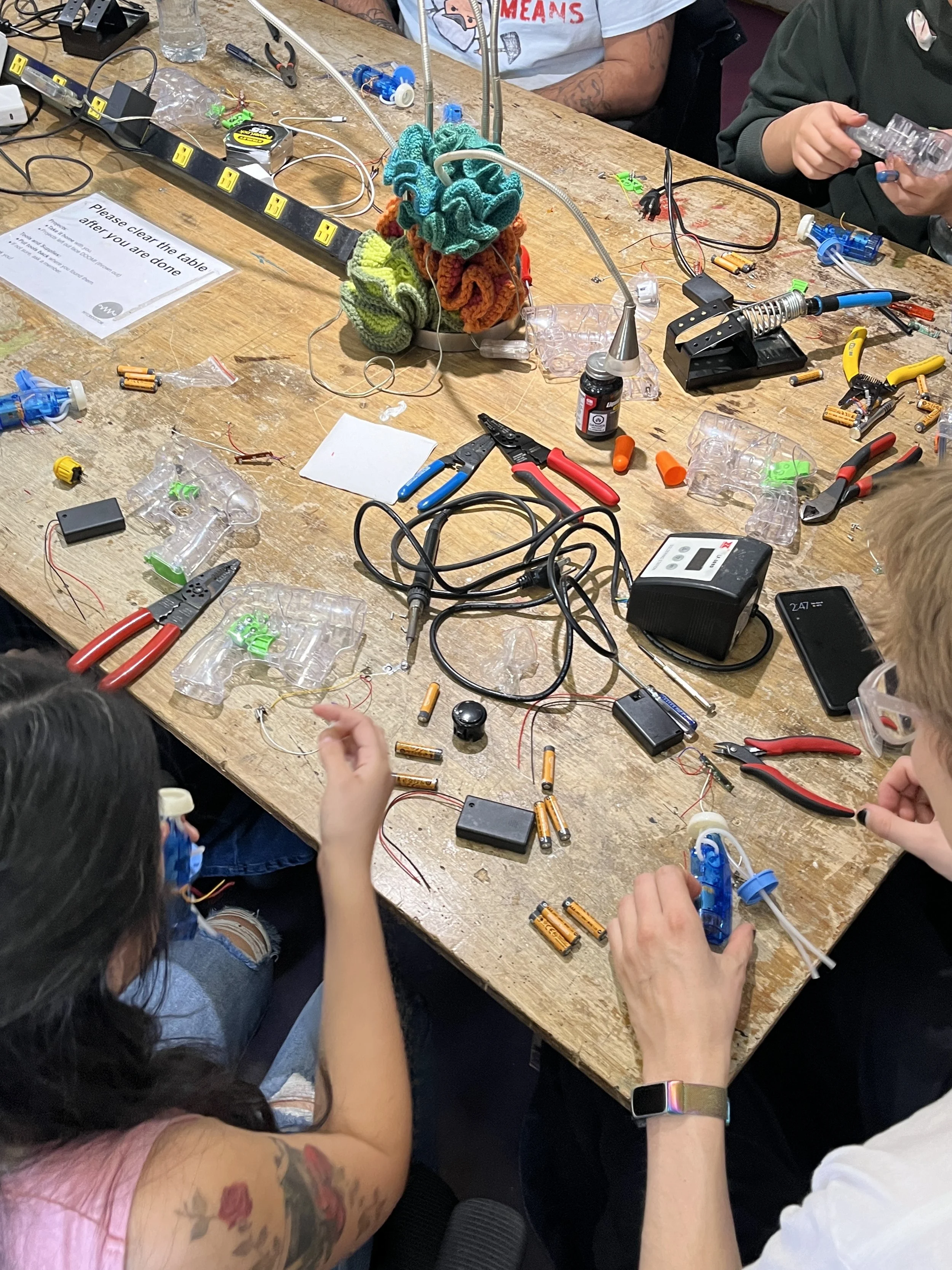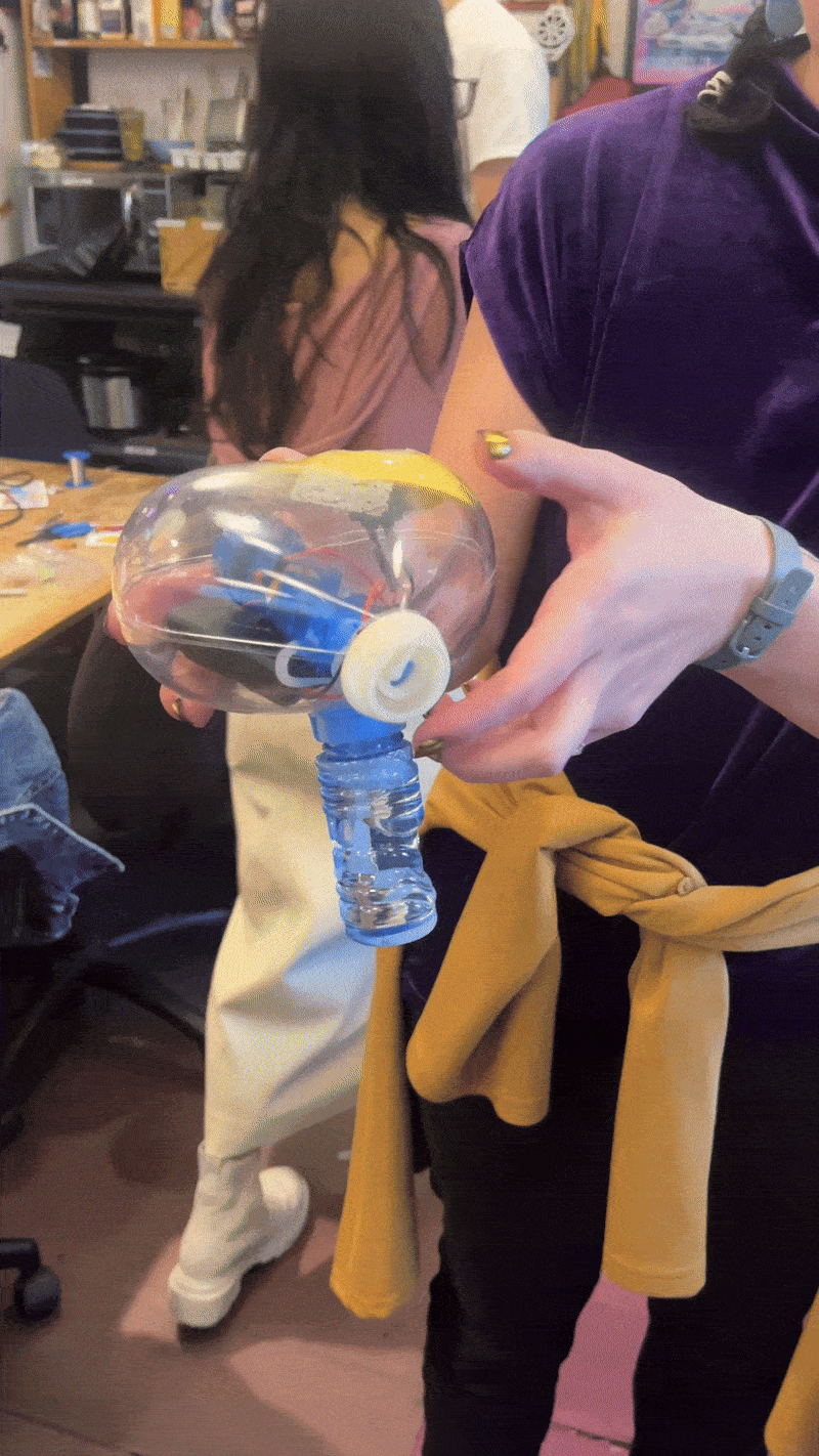 In this workshop, we invited participants from all levels of electronics skills, open to performers or non, to get their bubble on. First we showed how to open up the bubble toys. Then introduced the new circuit we would build with button control, tested it. A little intro on soldering and then we let participants pic from a variety of “props” we had sourced and helped them embed and hide the electronics within. This was really a ton of fun!