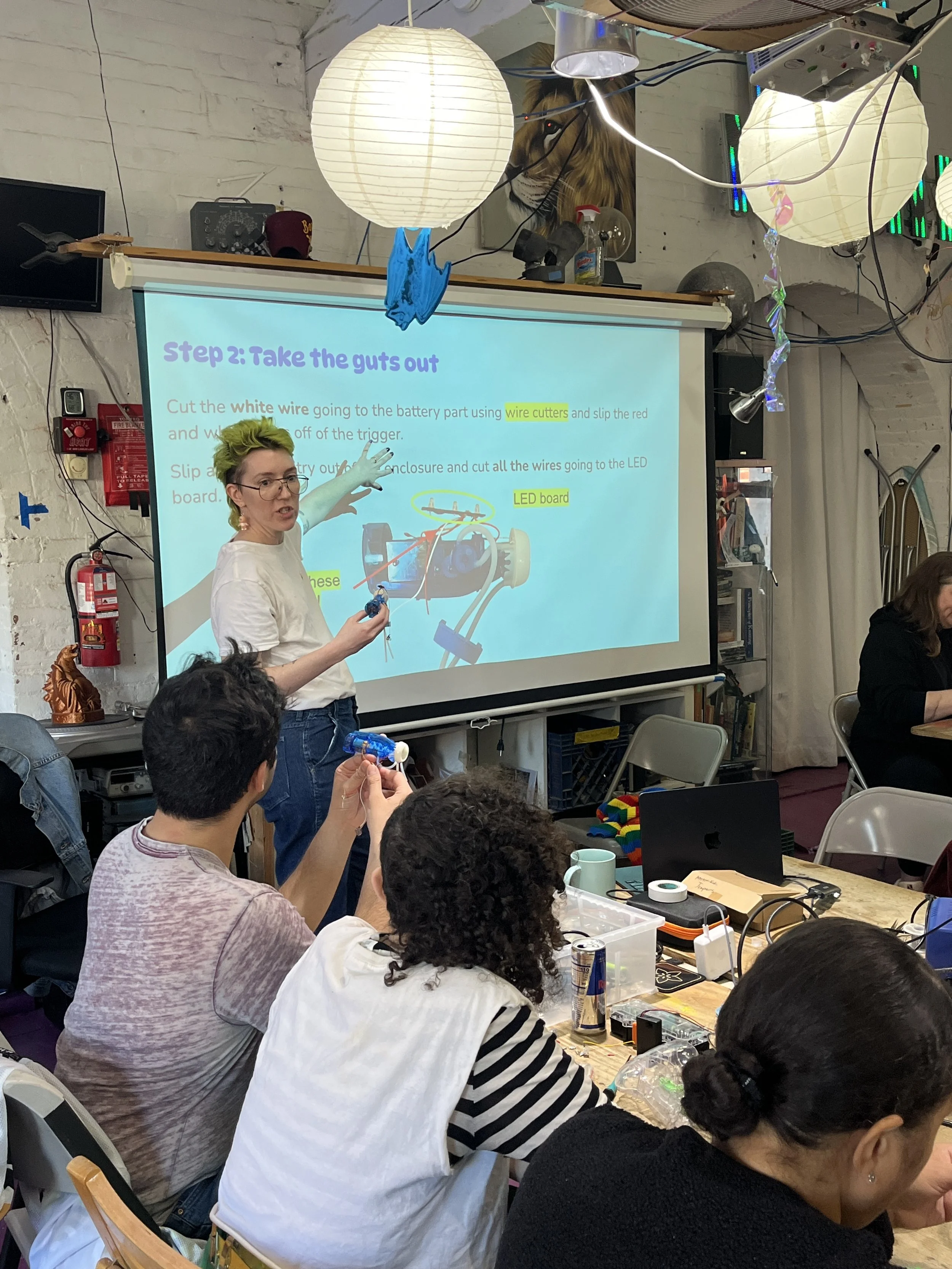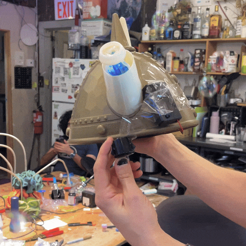 Next stop was my favorite ever hackerspace, NYC Resistor. Long-time collaborator Kay and I had been itching for the second installment of Dragtronics (electronics drag costuming and performance) for some time! Kay had found many great uses for what they had learned in Andy’s bubble gun workshop at OHS some years ago, so we thought we would go for it.