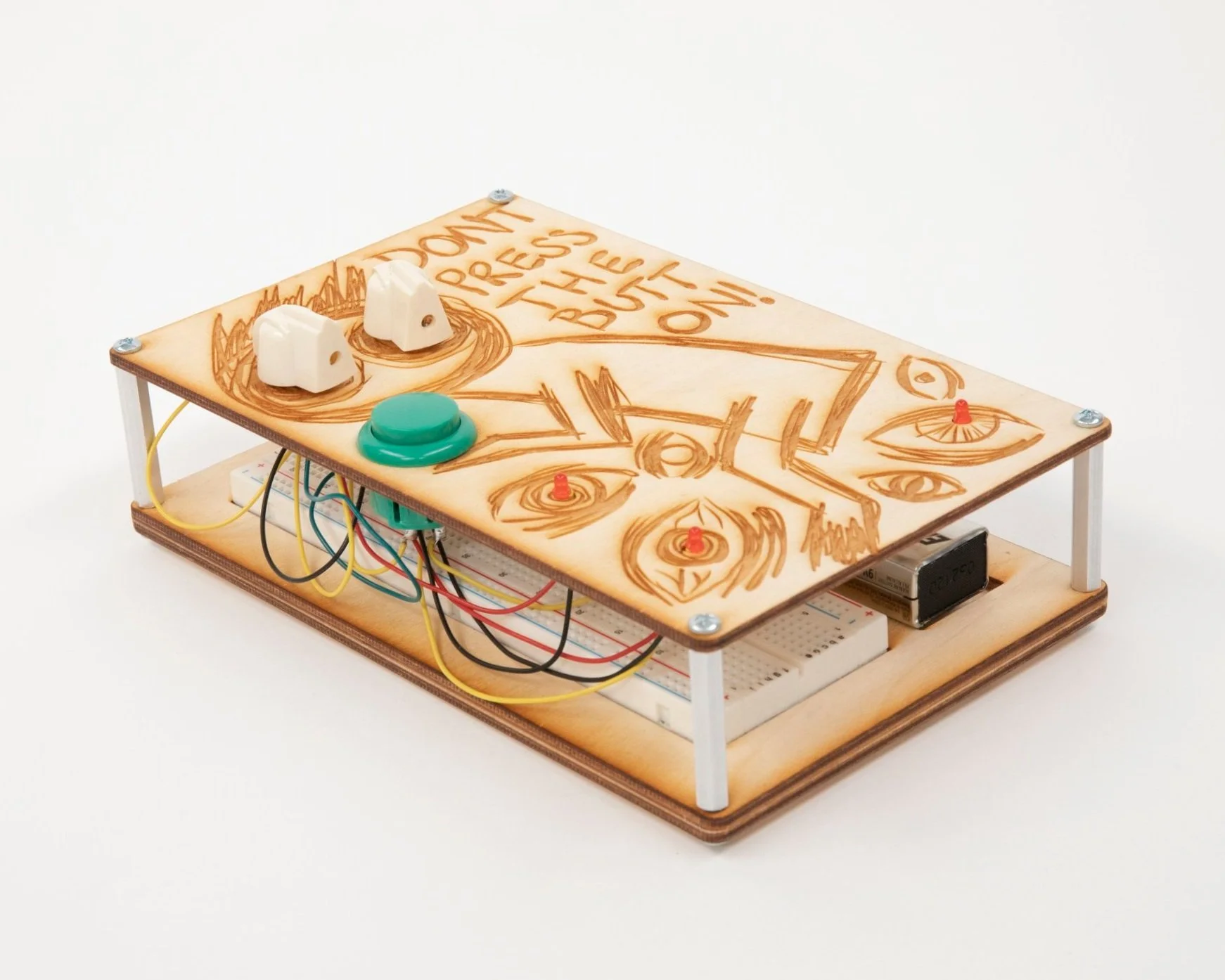 This is an enclosure I built for a really simple circuit. The big green button turns on the three LEDs and the two eye-knobs are attached to potentiometers that dim the LED brightness. I drew the graphics on my iPad and laser cut the wood panels. The breadboard with the circuit and the 9V battery are installed inside. DON’T PRESS THE BUTTON!